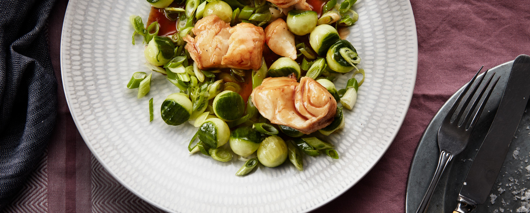 - Dish the cucumber and spring onion out on plates. Top with the fried fish then pour over the sauce from the frying pan.