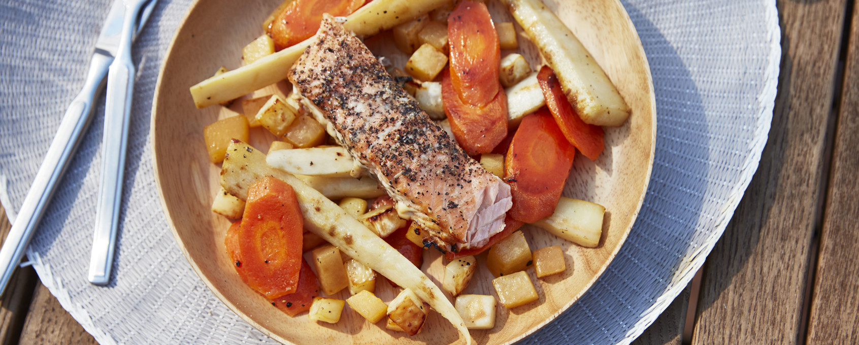 - Slice the carrots and root parsley and dice the celeriac and swede. Place the vegetables in aluminium foil with the olive oil, salt and pepper and place under the grill. Grill for 15-20 minutes