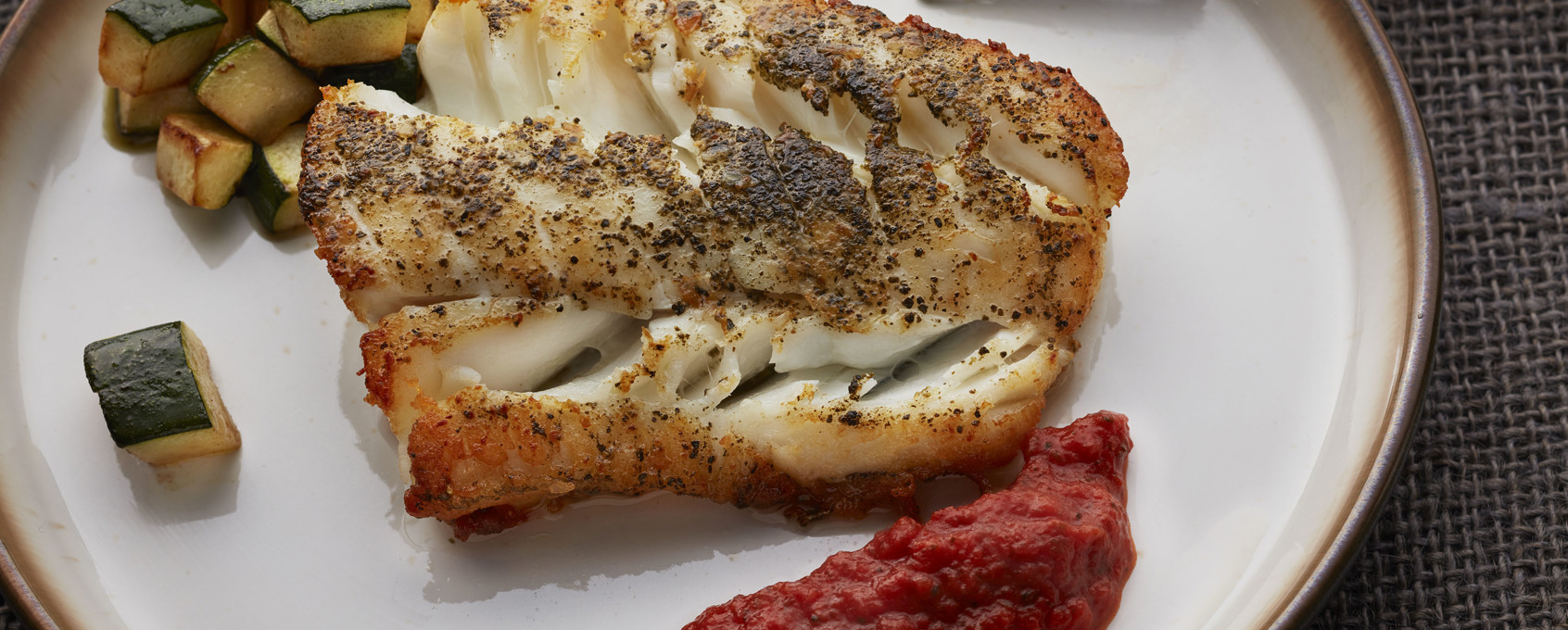 4. Serve the pan-fried cod with the olive-fried courgette and warm tomato sauce.