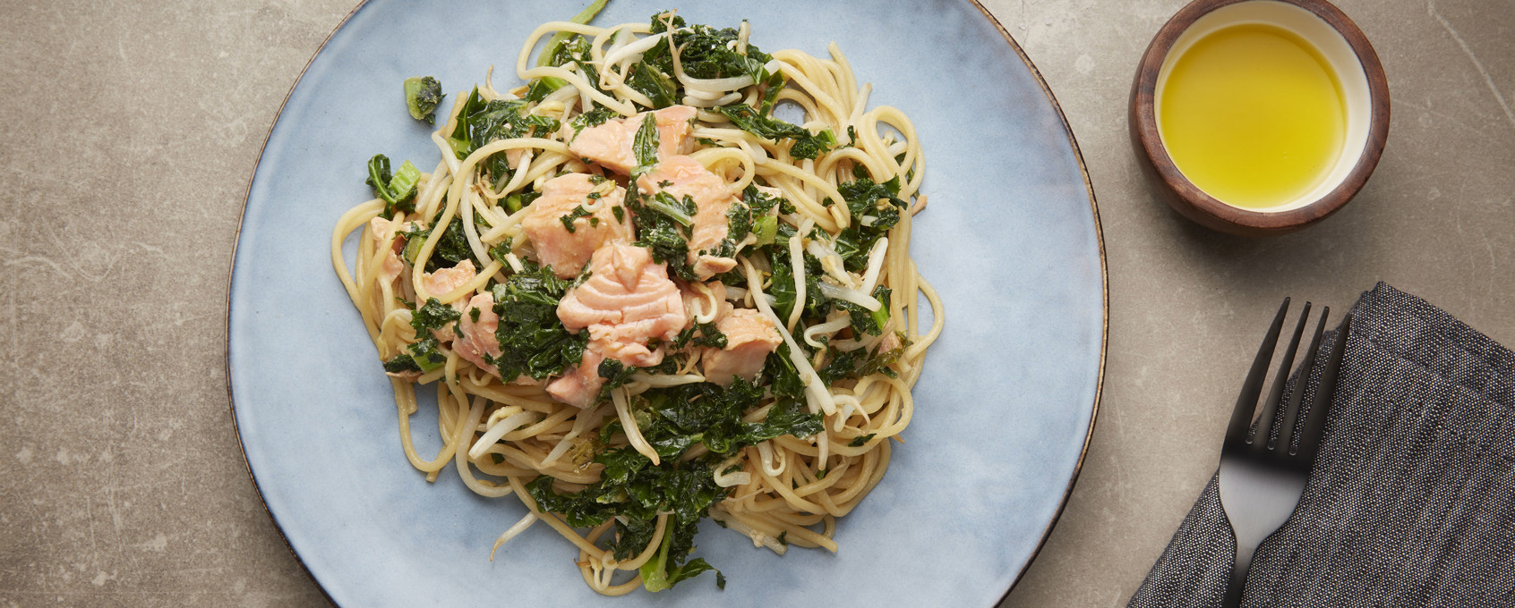 - Once the spaghetti is cooked, drain and add to the pan with the kale, salmon and bean sprouts. Pour over the soy sauce and lime mix and serve.