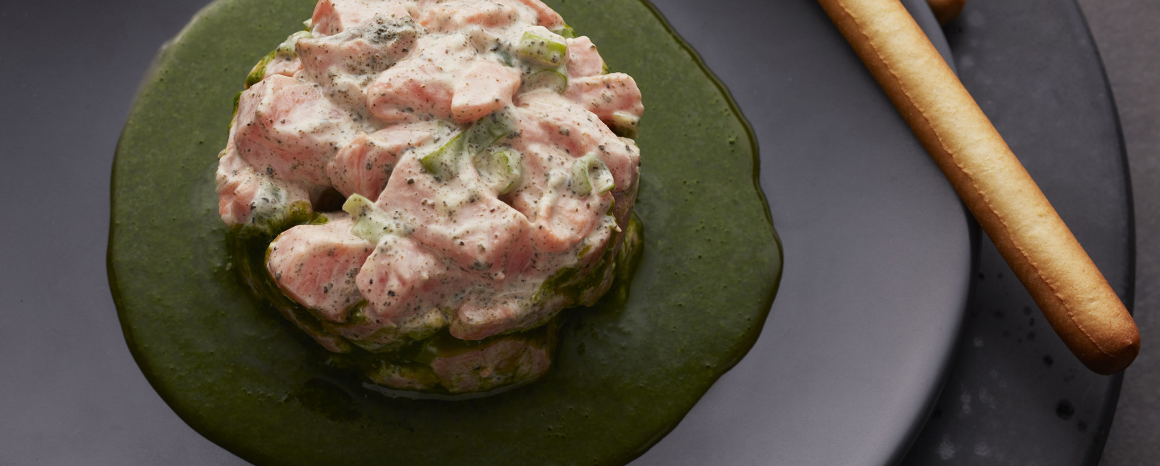 4. Serve the marinated trout tartare with breadsticks (grissini) and spinach sauce.