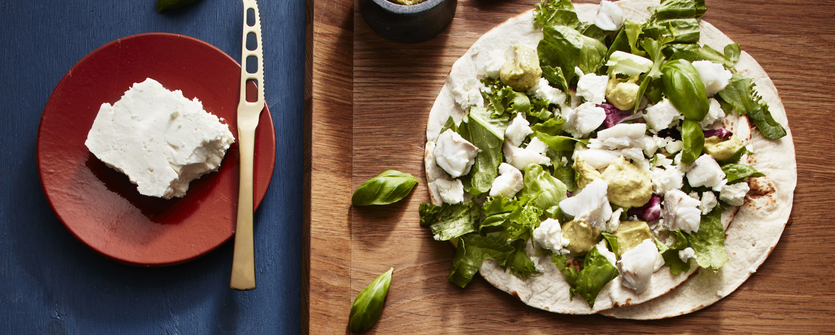 - Mix the pesto and mayonnaise and spread the mixture on the tortillas before topping with salad, feta cheese, cod and basil.