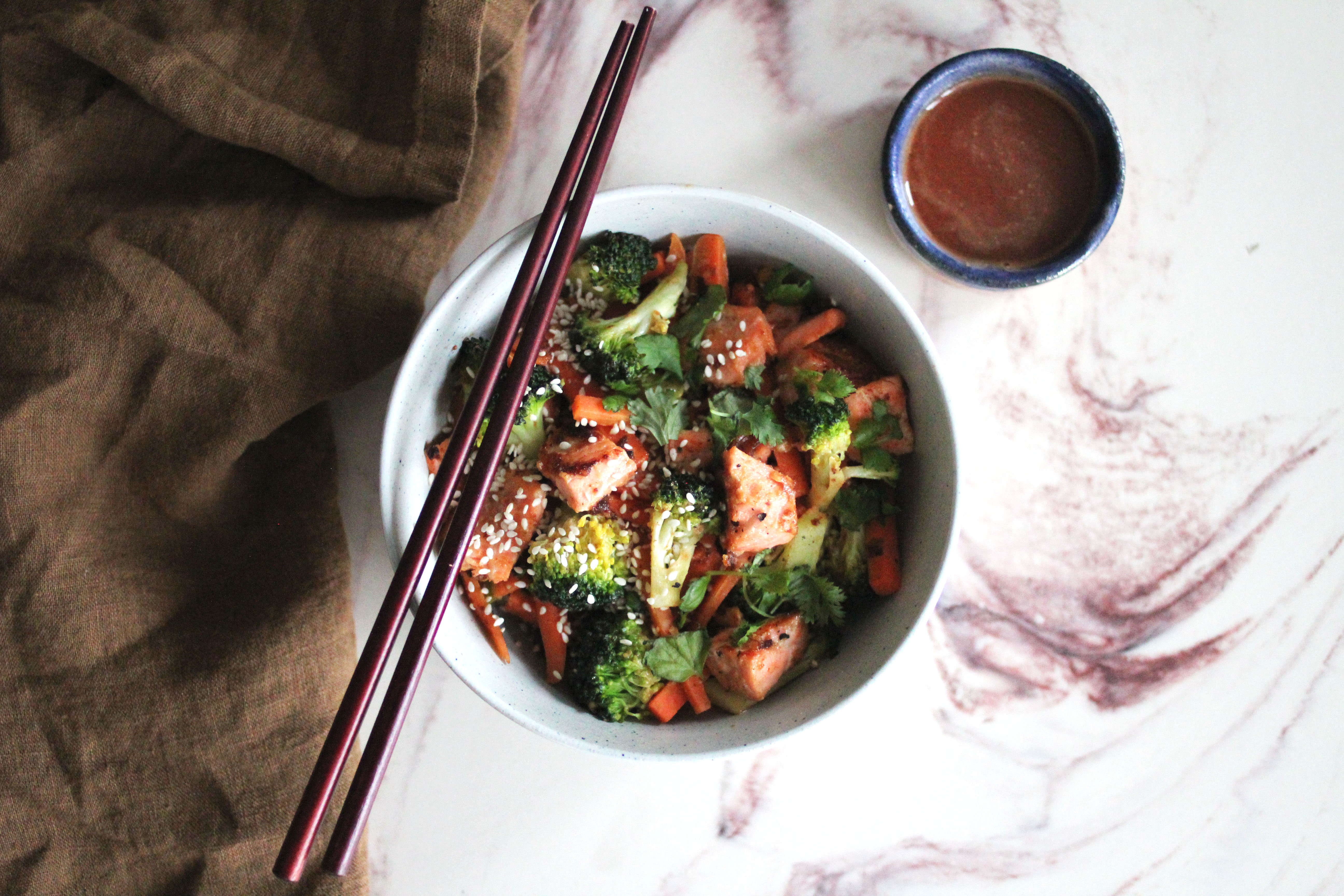 2. Det er ikke mange grønnsaker som ikke passer i en wok, derfor kan du benytte anledningen til å rydde ut av grønnsaksskuffen samtidig som du spiser usedvanlig godt. Wok med laks og peanøttsaus er middagstipset du kommer til å elske. God alene, eller med tilbehør som ris, nudler, quinoa eller pasta. Bruk wokpanne om du har, da blir grønnsakene varm og crunchy.