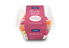 6. Dander sushiris i fire boller. Legg avokado og agurk i en rekke på hver side av bollen. Fordel laksen og pasjonsfrukt over risen. Strø vårløk over.
