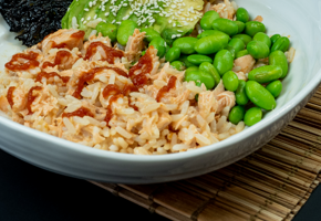5. Skjær avokadoen i strimler. Legg avokado og fyll på den crispy risen og pynt med en chili-ring. Klar for servering og en crunchy og spicy opplevelse!