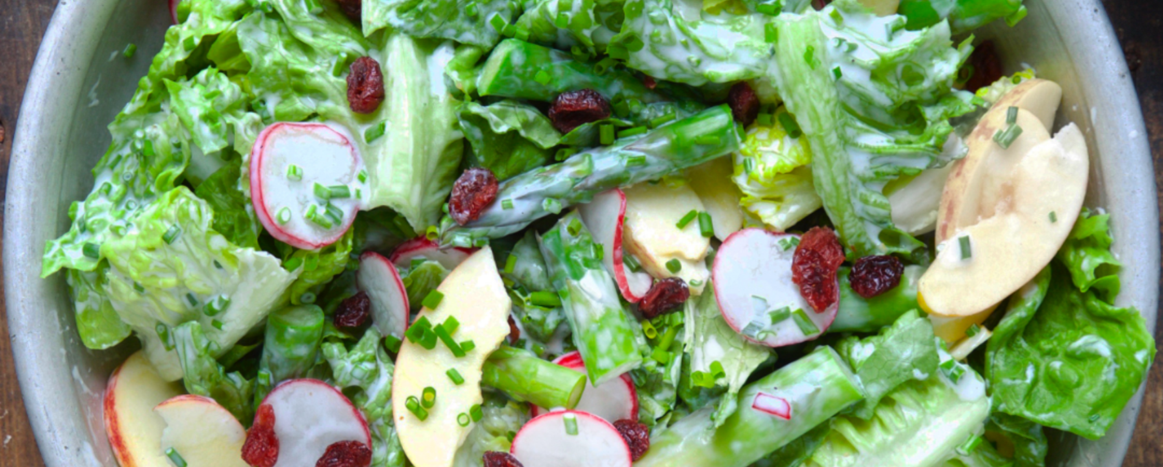 3. Riv salatblader i grove biter og bland med epler, reddiker, asparges og tranebær på et stort serverigsfat. Hell over dressingen og bland den i salaten. Salaten toppes med litt mer tranebær som en siste finish!