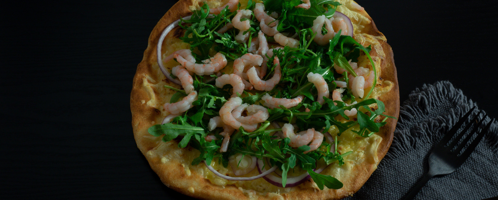 5. Pynt den nystekte pizzaen med kuttet rødløk i ringer, ruccolaen og reker. Dryss over med litt olivenolje rett før servering.