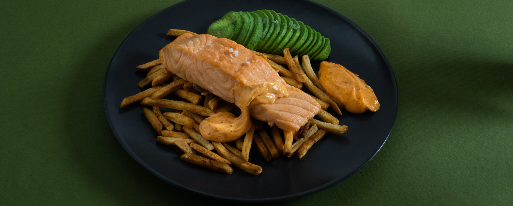 5. Dander pommes frites og laksen på en tallerken, og server med skivet avokado og dressing.