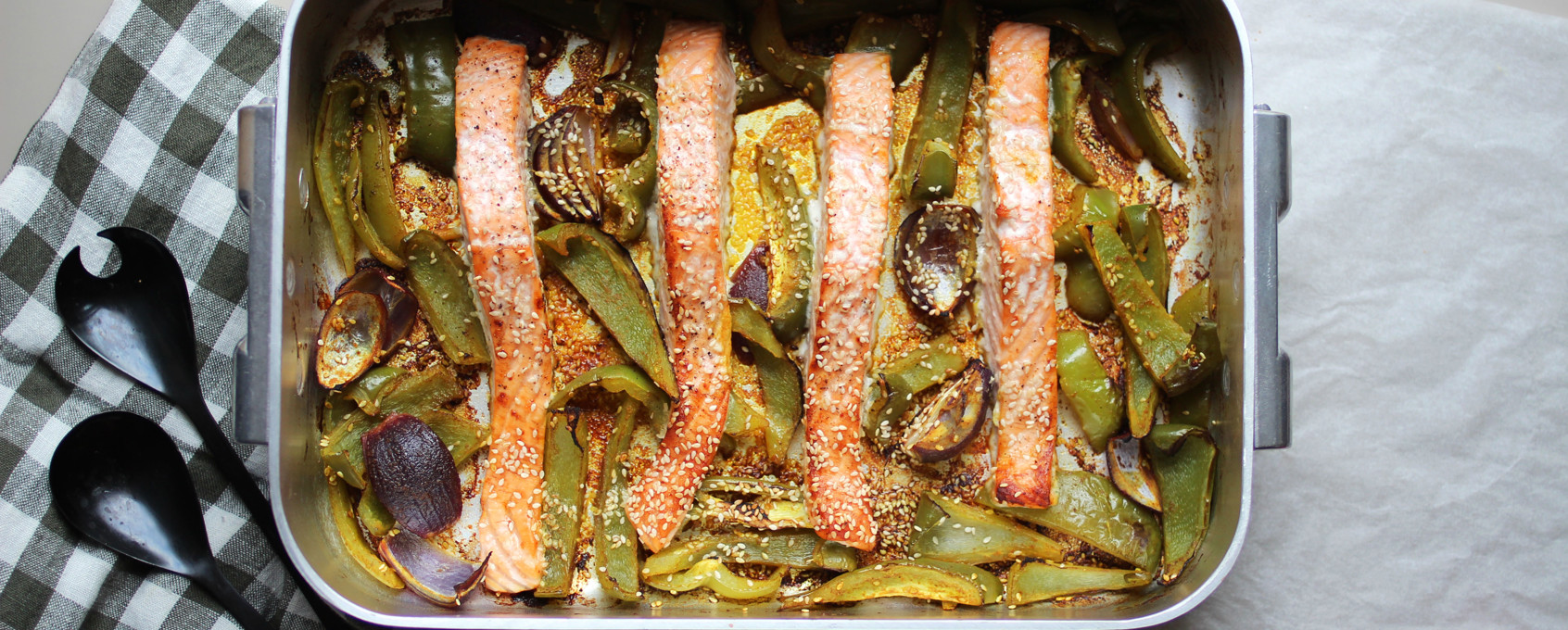 - Ha grønnsaker og saus over i en ildfast form, og vend sammen. Plasser laksefiletene mellom grønnsakene, og dryss over resten av sesamfrøene.