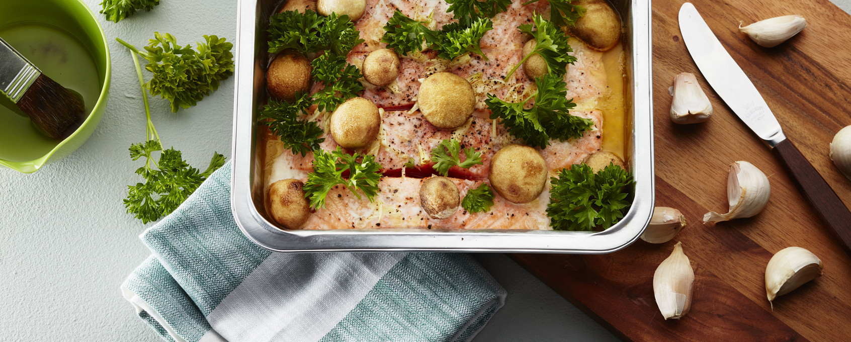 2. Ha hele sjampinjonger, hvitløk i strimler, salt og pepper over laksefiletene i aluminiumformen. Bruk eventuelt en ildfast form.