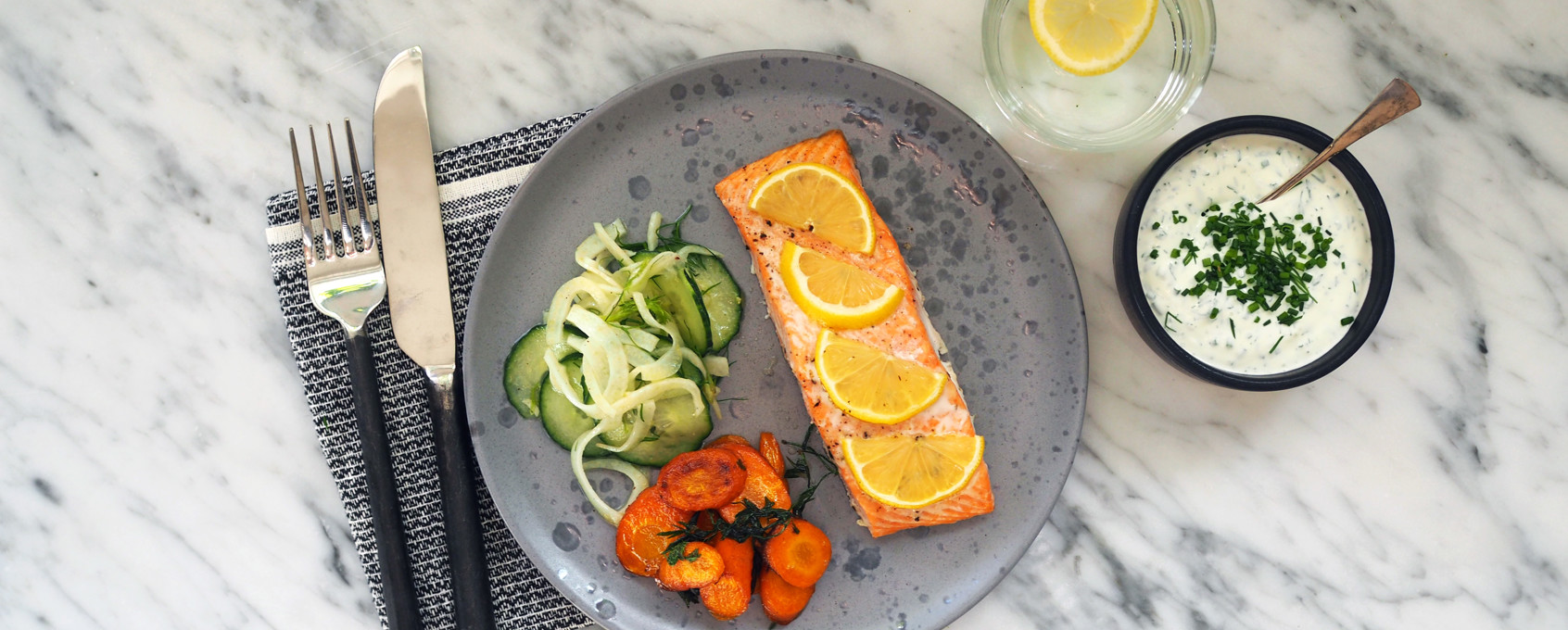 Fremgangsmåte laks med agurk- og fennikelsalat med urterømme: