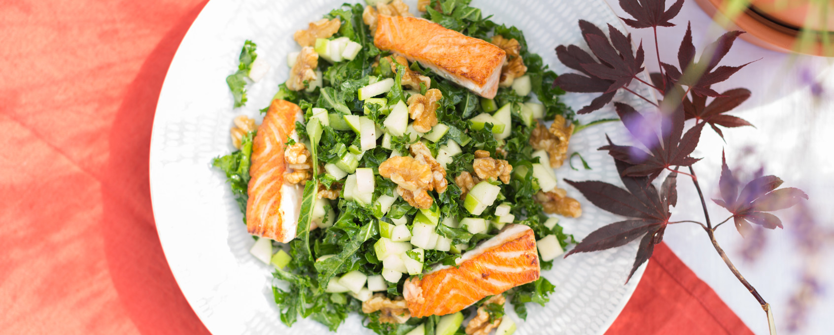 1. Skjær eple i terninger. Bland grønnkål, valnøttkjerner og eplebitene sammen.Tilsett olivenolje, saften av en halv sitron, og salt og pepper.