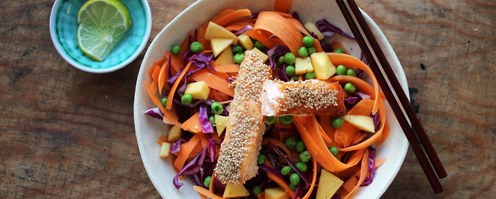 Fremgangsmåte på laks panert i sesamfrø med mango- og rødkålsalat: