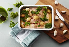 3. Kutt squash og laks i skiver. Legg dem sammen med potetene i en ildfast form.