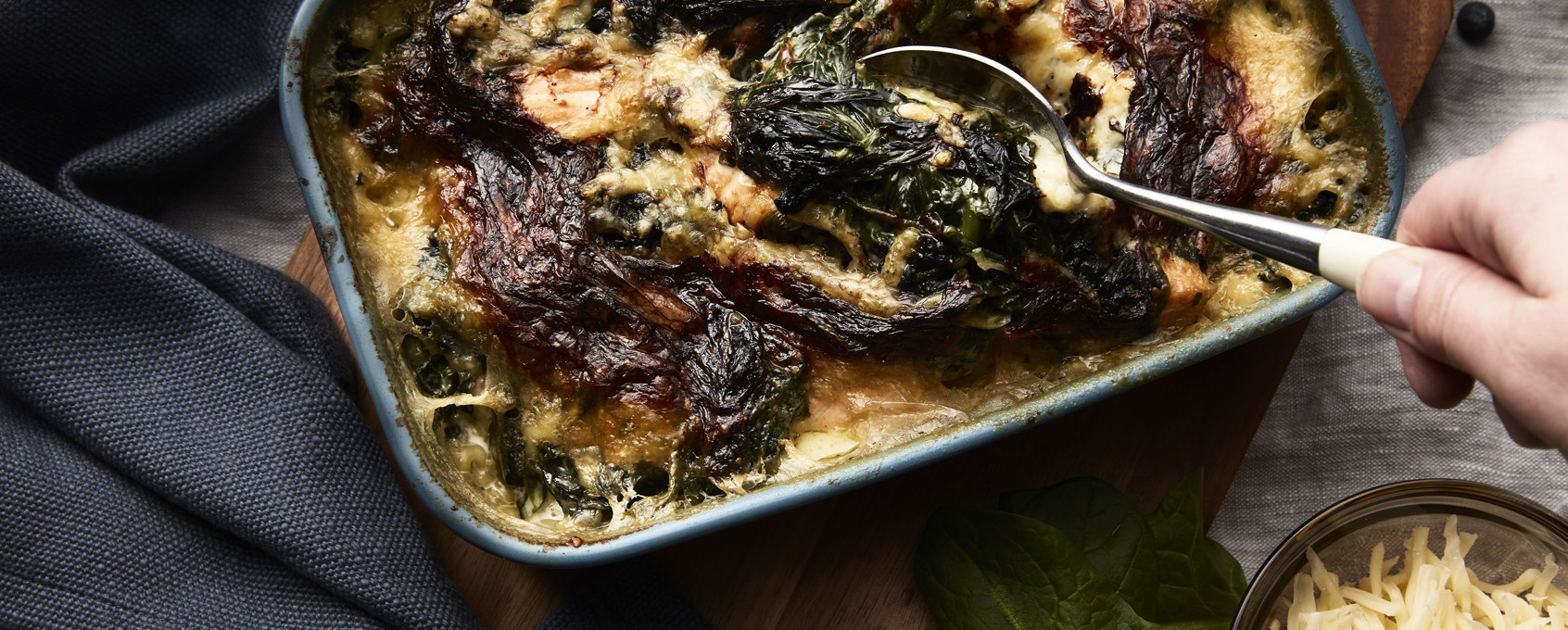 4. Legg lasagneplater i bunnen av en ildfast form og legg halvparten av lakseterningene oppå. Hell over halvparten av kremsausen med spinat. Gjenta med lasagneplater, laks og resten av kremsausen.