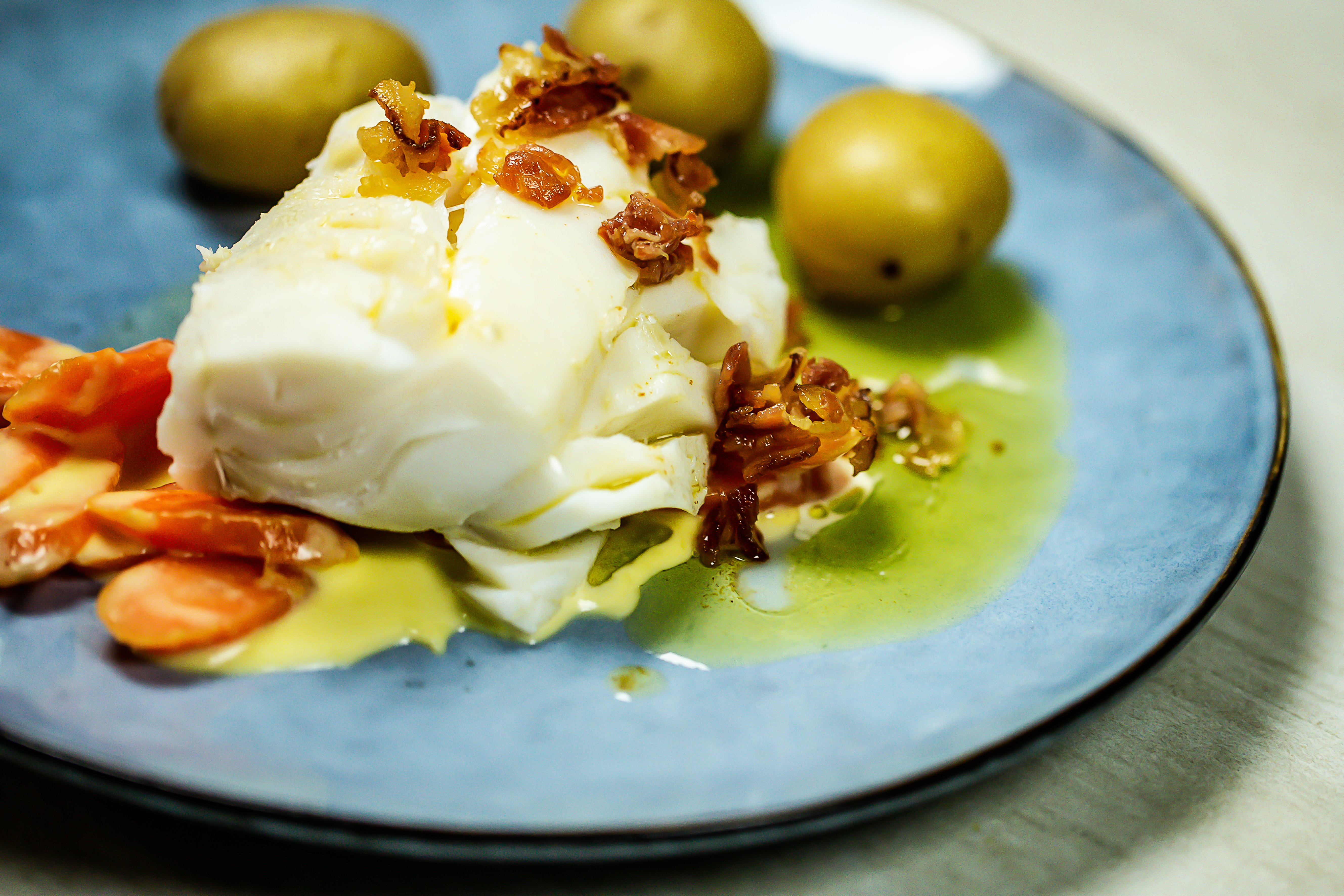 Skrei i kremet saus med bacon og urtesalat