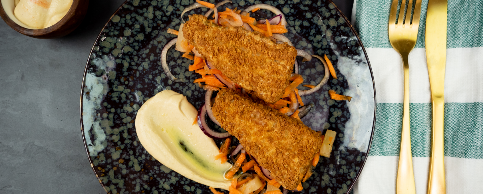 5. Server panert sei med råkost og ønsket mengde hummus.