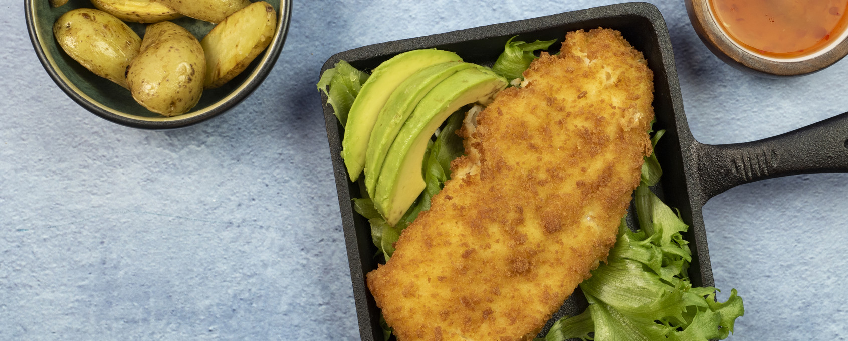 Fremgangsmåte på Panert torskefilet med avokado og potetbåter: