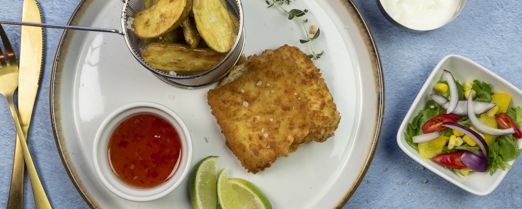 3. Server den nystekte fisken og salaten sammen med sweet chili saus, rømme og saften av en limebåt. Krydre med salt og pepper etter ønske.