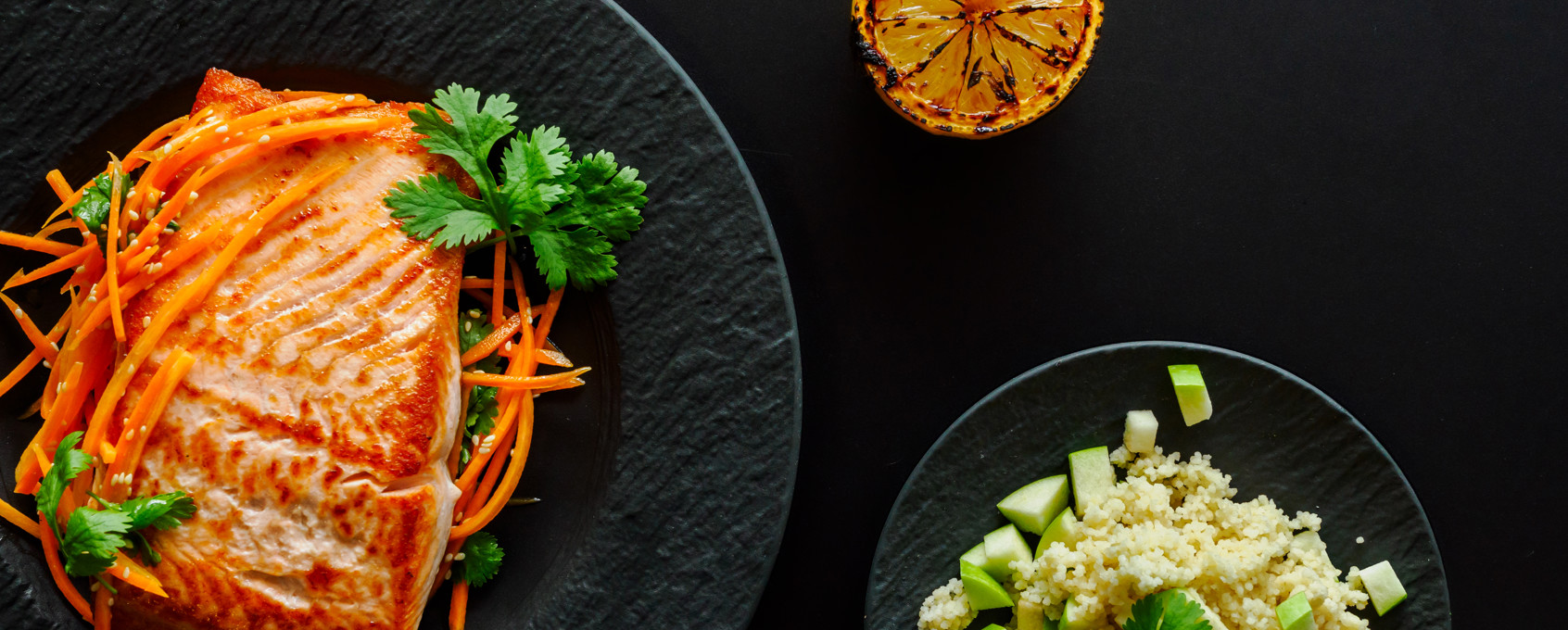 6. Server pannestekt renskåret laks med gulrotsalaten og couscousen på siden.