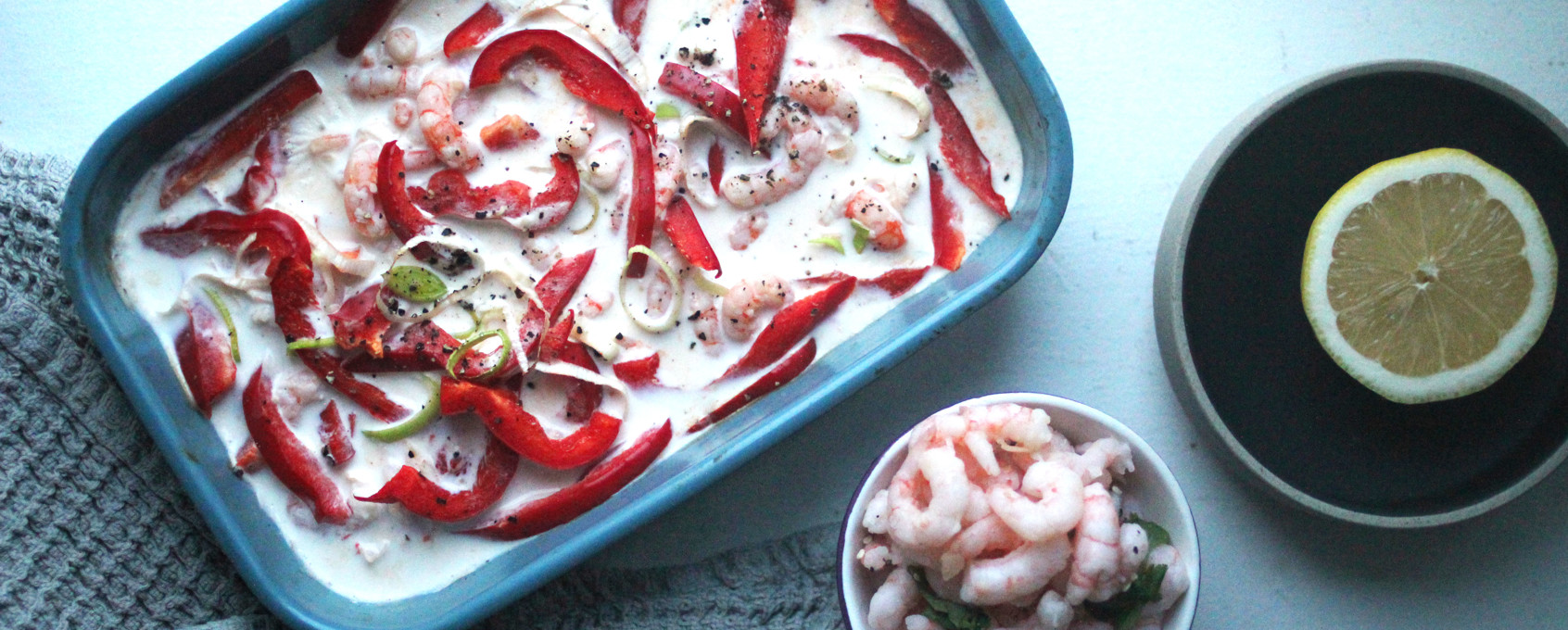 2. Del paprika i tynne strimler og purren i tynne skiver. Fordel grønnsakene i en ildfast form sammen med rekene.