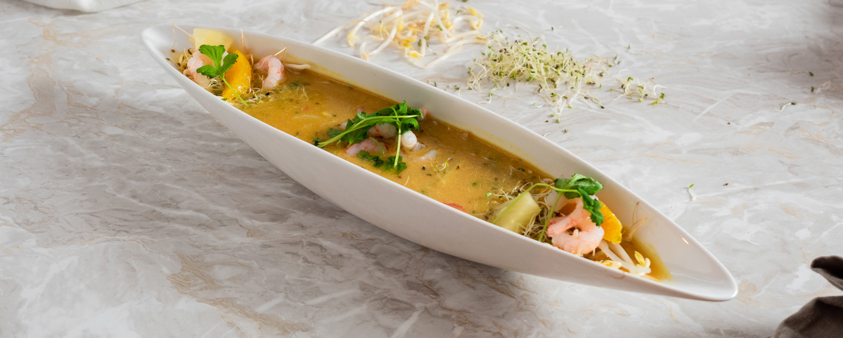Fremgangsmåte på rekesuppe med karri, kokosmelk, spirer, koriander og appelsin: