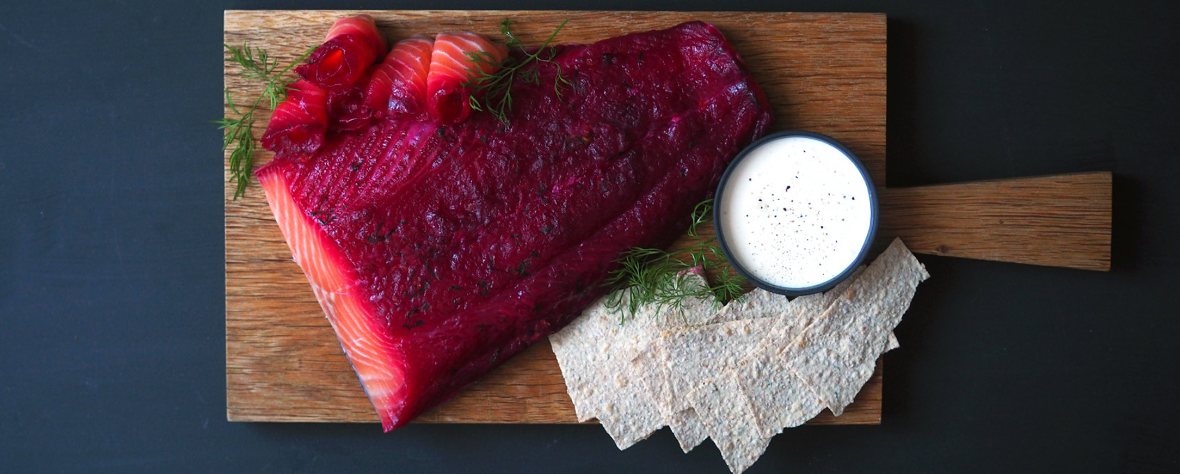 5. Etter minst 48 timer tar du ut formen og skraper forsiktig av rødbetblandingen. Du kan gjerne skylle av fileten. Tørk godt etterpå. Nå er fisken ferdig gravet og kan skjæres i tynne skiver.