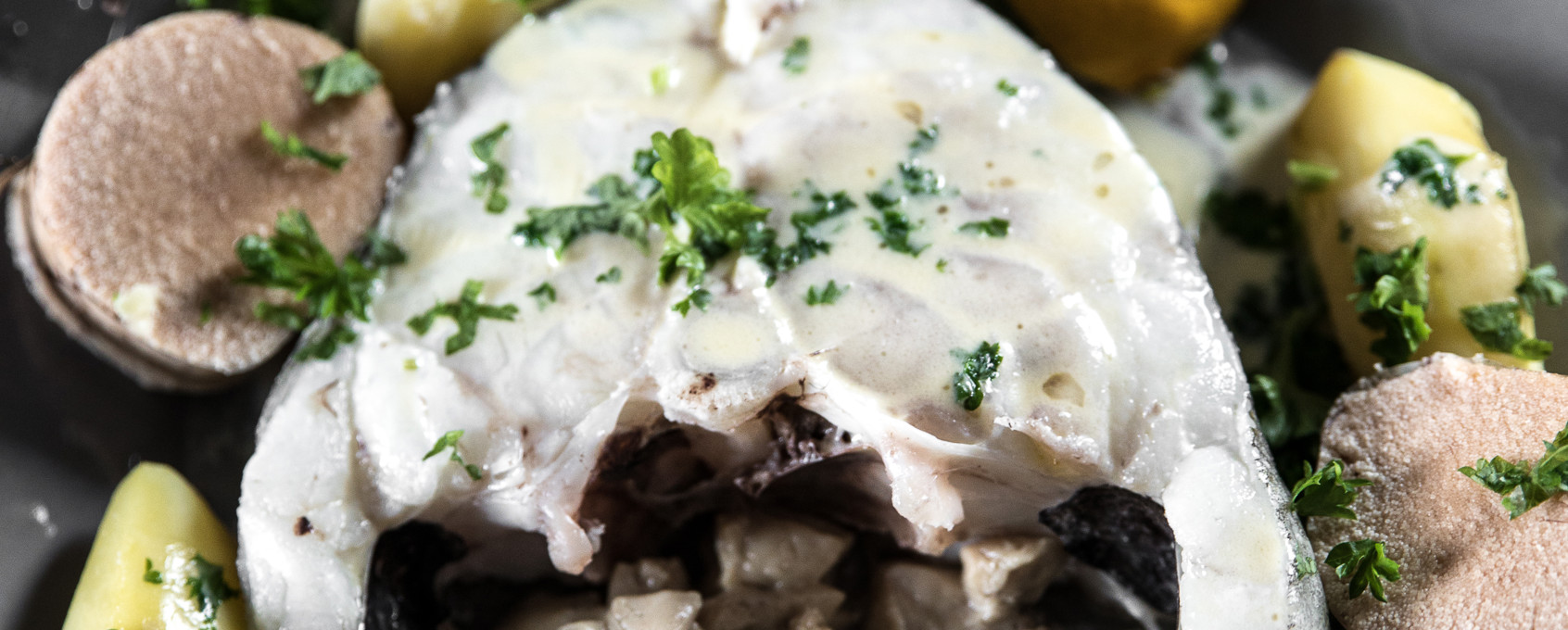 7. Server skreien på varme tallerkener med kokt rogn skåret i skiver, lever og kokte poteter.