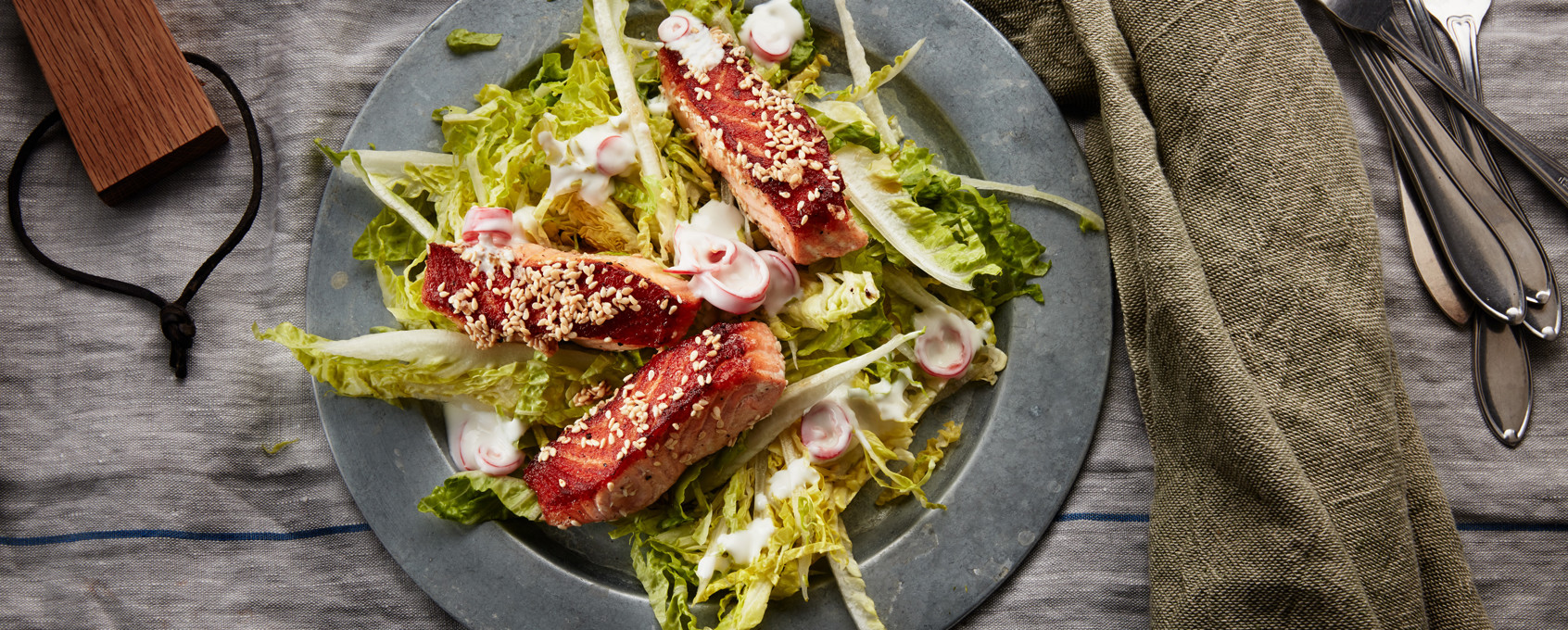 3. Stek fisken i en stekepanne på middels varme, 2-3 minutter på hver side. Ved slutten av steketiden har du i 4 ss sesamolje og 2 ss sesamfrø, vend fiskefiletene i dette før du legger stykkene på salaten.