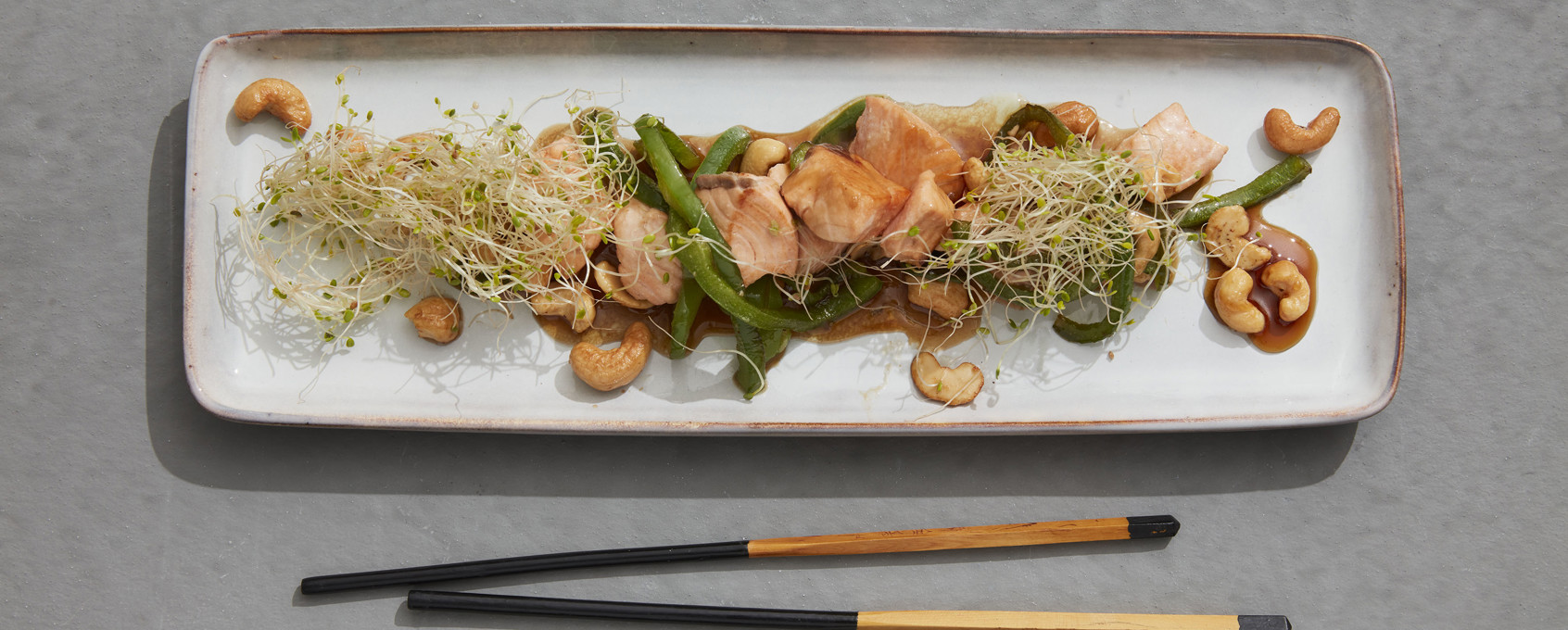 5. Server laksewok med paprika og cashewnøtter toppet med alfaspirer.