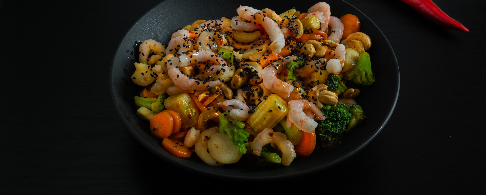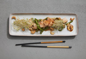 3. Retten serveres umiddelbart og toppes med cashewnøtter og svarte sesamfrø.