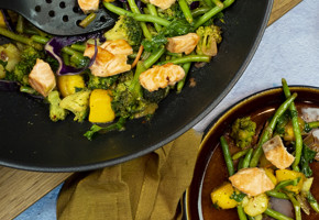 2. Ha rekene oppi pannen med wokblandingen og hell over sweet chilisaus. Blandingen varmes lett.
