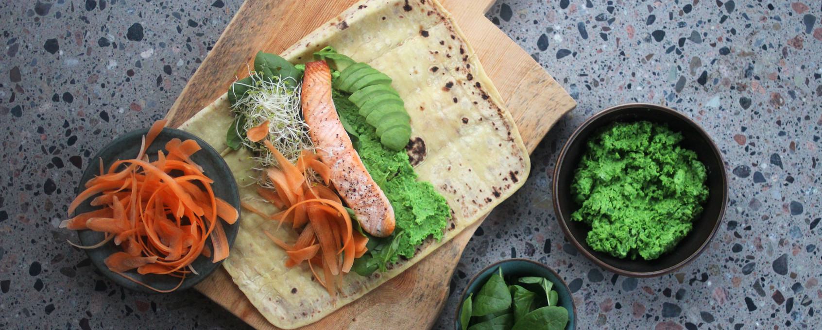 Fremgangsmåte på wrap med laks, ertepuré og avocado
