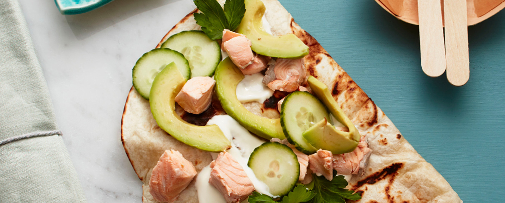 4. Smør crème fraîche på hver av tortillalefsene før du legger på fisk og grønnsaker.