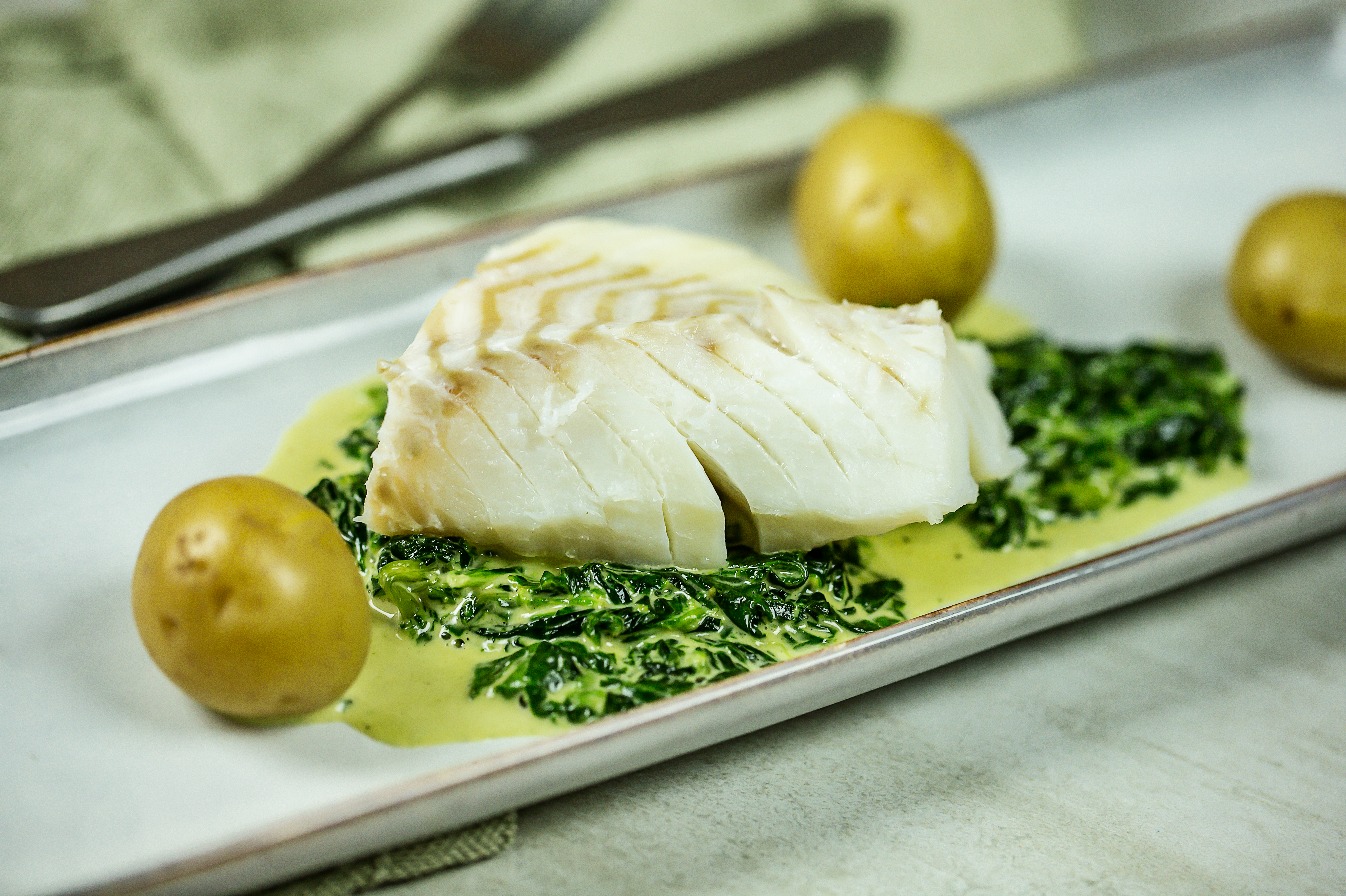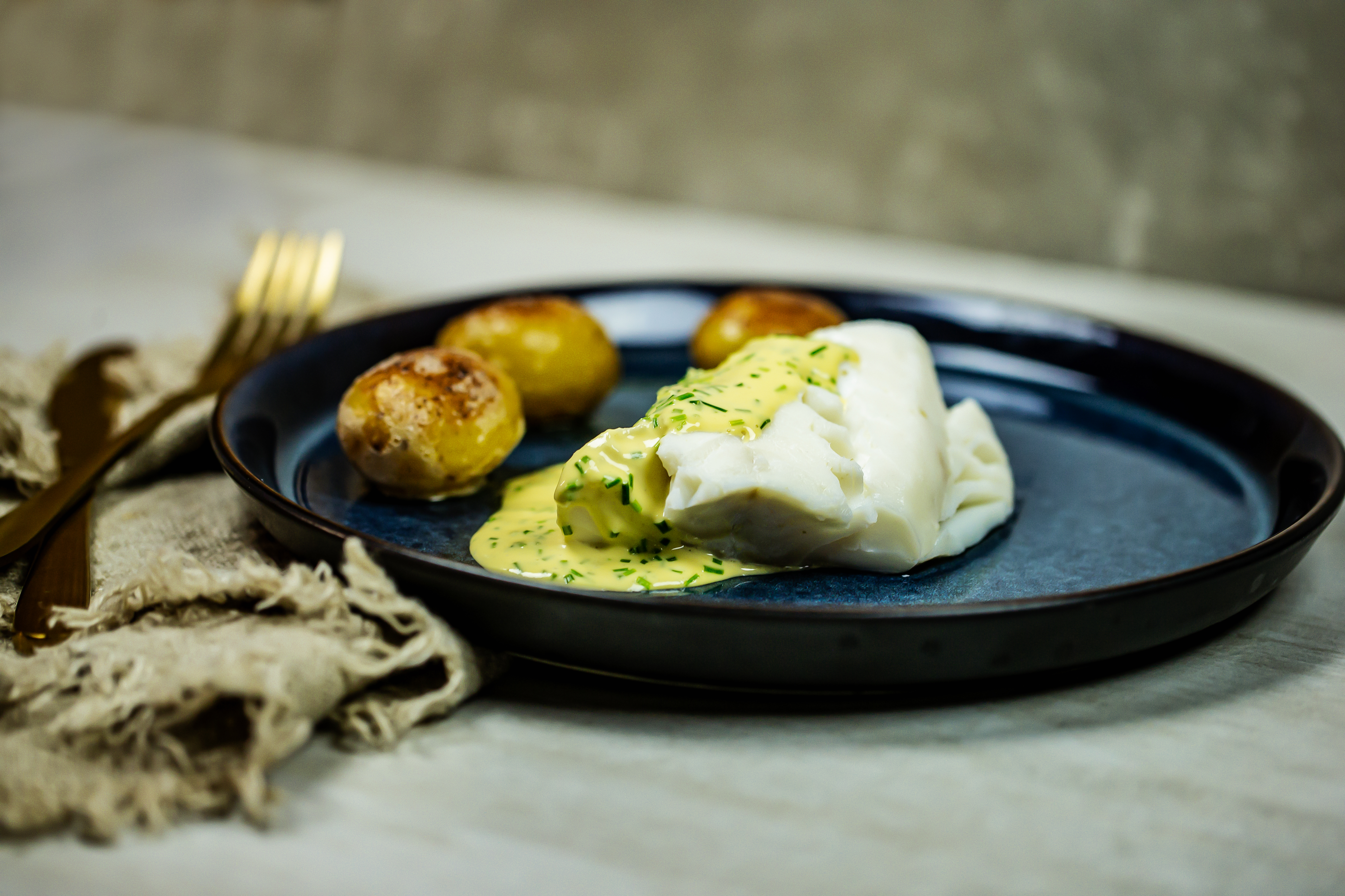 Lettsaltet torsk med sennepskrem og smørbakte minipoteter