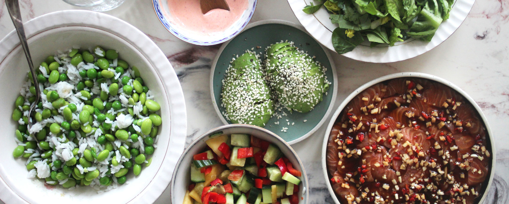 Tillagning sashimi med avokado, sallad och mangosalsa: