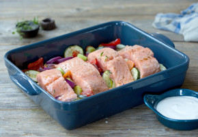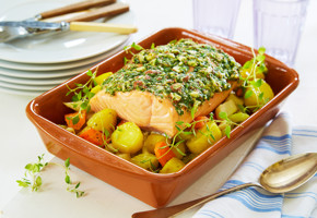 İnce, keskin bir bıçak yardımı ile derilerinden dikkatlice ayrılan somon filetolar uzun şeritler halinde 8 porsiyona ayrılır. Yağ sürülerek tuz ve karabiber serpilen filetoların üzerine yarım misket limonu suyu yarısı gezdirilir.